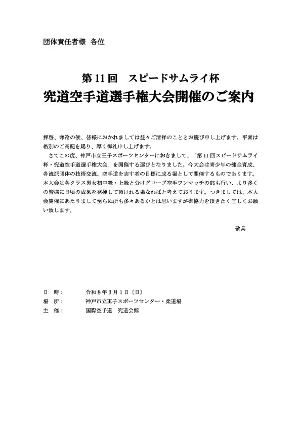 令和8年3月1日(日)開催予定の国際空手道 究道会館 主催 第11回スピードサムライ杯究道空手道選手権大会のグローブ空手の大会要項を修正しました。